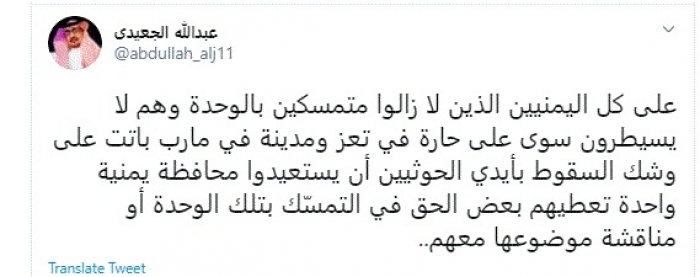 وقال في تغريدة عبر "تويتر" رصدها "المشهد العربي": "على كل اليمنيين الذين لا زالوا متمسكين بالوحدة وهم لا يسيطرون سوى على حارة في تعز ومدينة في مأرب باتت على وشك السقوط بأيدي الحوثيين أن يستعيدوا محافظة يمنية واحدة تعطيهم بعض الحق في التمسّك بتلك الوحدة أو مناقشة موضوعها معهم".