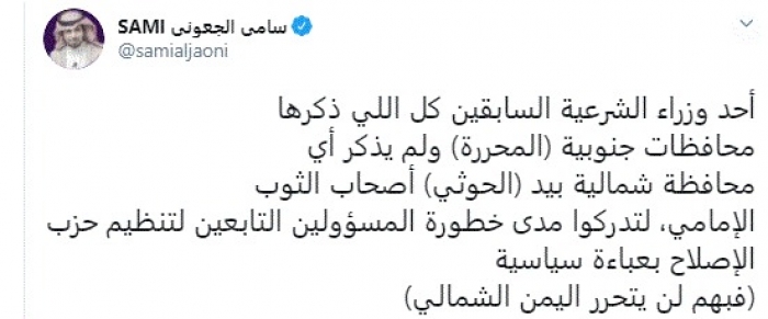 وقال في تغريدة عبر "تويتر" رصدها "المشهد العربي": "أحد وزراء الشرعية السابقين كل اللي ذكرها محافظات جنوبية (المحررة) ولم يذكر أي محافظة شمالية بيد (الحوثي) أصحاب الثوب الإمامي".
