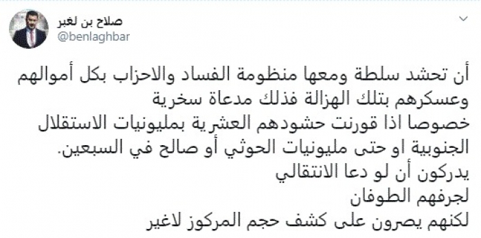 وقال في تغريدة عبر "تويتر" رصدها "المشهد العربي": "أن تحشد سلطة ومعها منظومة الفساد والأحزاب بكل أموالهم وعسكرهم بتلك الهزالة فذلك مدعاة سخرية خصوصًا إذا قورنت حشودهم العشرية بمليونيات الاستقلال الجنوبية أو حتى مليونيات الحوثي أو صالح في السبعين".