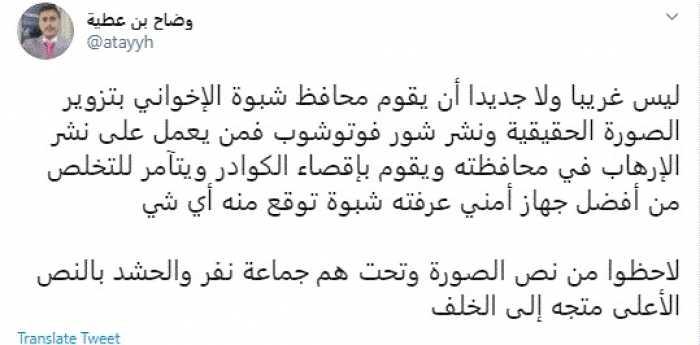 وقال في تغريدة عبر "تويتر" رصدها "المشهد العربي": "ليس غريبًا ولا جديدًا أن يقوم محافظ شبوة الإخواني بتزوير الصورة الحقيقية ونشر صور فوتوشوب فمن يعمل على نشر الإرهاب في محافظته ويقوم بإقصاء الكوادر ويتآمر للتخلص من أفضل جهاز أمني عرفته شبوة توقع منه أي شيء".