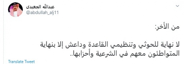 وكتب في تغريدة عبر "تويتر" رصدها "المشهد العربي": "من الأخر: لا نهاية للحوثي وتنظيمي القاعدة وداعش إلا بنهاية المتواطئون معهم في الشرعية وأحزابها".