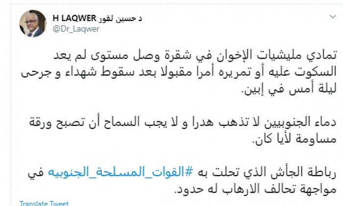 وقال في تغريدة عبر "تويتر" رصدها "المشهد العربي": "تمادي مليشيات الإخوان في شقرة وصل مستوى لم يعد السكوت عليه أو تمريره أمرًا مقبولًا بعد سقوط شهداء وجرحى ليلة أمس في أبين".