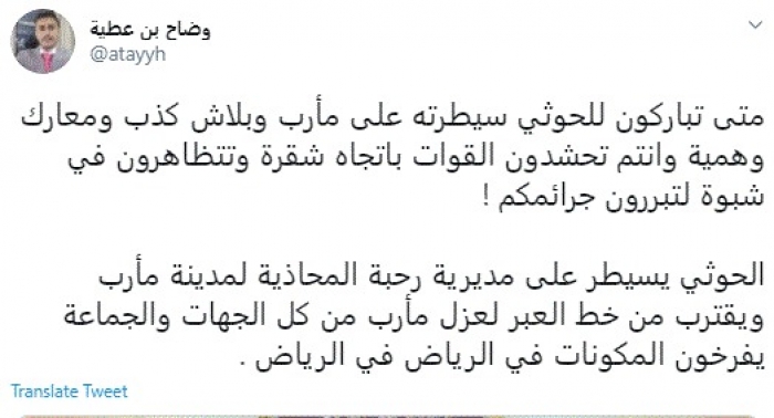 وقال في تغريدة عبر "تويتر" رصدها "المشهد العربي": "متى تباركون للحوثي سيطرته على مأرب وبلاش كذب ومعارك وهمية وأنتم تحشدون القوات باتجاه شقرة وتتظاهرون في شبوة لتبررون جرائمكم".
