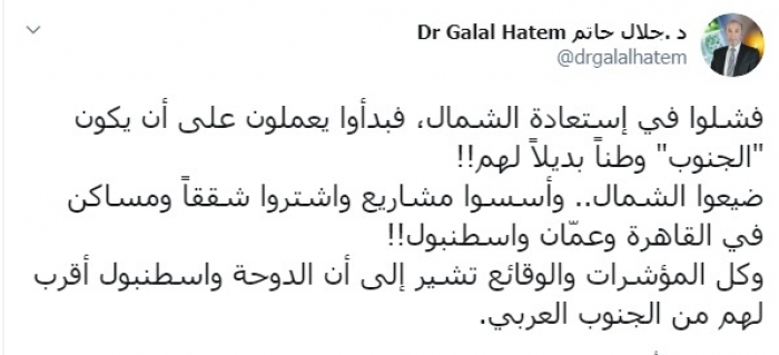 وكتب عبر تغريدة له على "تويتر" رصدها "المشهد العربي": "فشلوا في استعادة الشمال، فبدأوا يعملون على أن يكون "الجنوب" وطنا بديلا لهم، ضيعوا الشمال وأسسوا مشاريع واشتروا شققا ومساكن في القاهرة وعمّان وإسطنبول، وكل المؤشرات والوقائع تشير إلى أن الدوحة وإسطنبول أقرب لهم من الجنوب العربي".