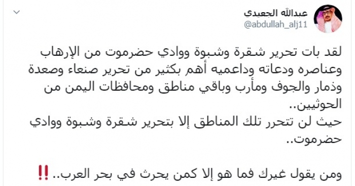 وكتب عبر تغريدة له على "تويتر" رصدها "المشهد العربي": "لقد بات تحرير شقرة وشبوة ووادي حضرموت من الإرهاب وعناصره ودعاته وداعميه أهم بكثير من تحرير صنعاء وصعدة وذمار والجوف ومأرب وباقي مناطق ومحافظات اليمن من الحوثيين، حيث لن تتحرر تلك المناطق إلا بتحرير شقرة وشبوة ووادي حضرموت، ومن يقول غيرك فما هو إلا كمن يحرث في بحر العرب".