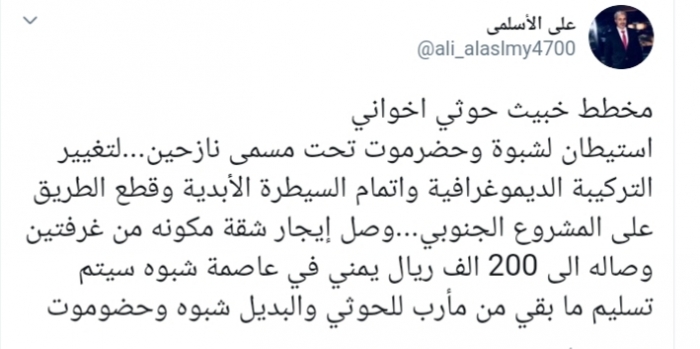 وكتب عبر تغريدة له على "تويتر" رصدها "المشهد العربي": "مخطط خبيث حوثي إخواني، استيطان لشبوة وحضرموت تحت مسمى نازحين لتغيير التركيبة الديموغرافية وإتمام السيطرة الأبدية وقطع الطريق على المشروع الجنوبي".