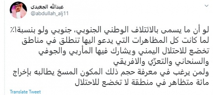 وقال في تغريدة عبر "تويتر" رصدها "المشهد العربي": "لو أن ما يسمى بالائتلاف الوطني الجنوبي، جنوبي ولو بنسبة1 % لما كانت كل المظاهرات التي يدعو اليها تنطلق في مناطق تخضع للاحتلال اليمني ويشارك فيها المأربي والجوفي والسنحاني والتعزّي والإفريقي".