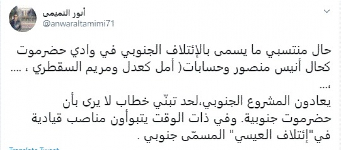وقال في تغريدة عبر "تويتر" رصدها "المشهد العربي": "حال منتسبي ما يسمى بالإئتلاف الجنوبي في وادي حضرموت كحال أنيس منصور وحسابات (أمل كعدل ومريم السقطري ، .... ،".