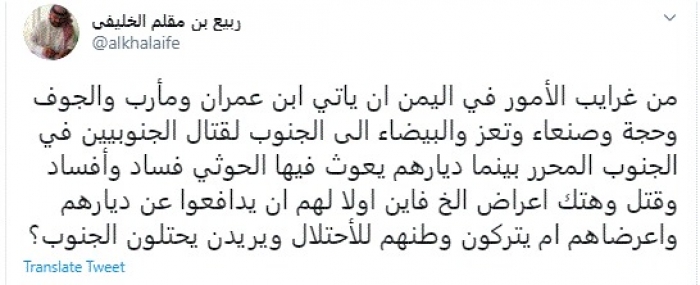 وقال في تغريدة عبر "تويتر" رصدها "المشهد العربي": "من غرائب الأمور في اليمن أن ياتي ابن عمران ومأرب والجوف وحجة وصنعاء وتعز والبيضاء إلى الجنوب لقتال الجنوبيين في الجنوب المحرر".