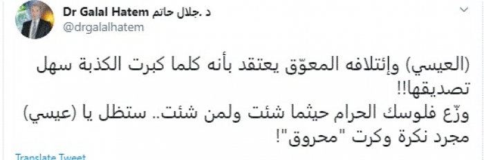 وقال في تغريدة عبر "تويتر" رصدها "المشهد العربي": "(العيسي) وائتلافه المعوّق يعتقد بأنه كلما كبرت الكذبة سهل تصديقها".