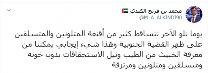 وكتب عبر تغريدة له على "تويتر" رصدها "المشهد العربي": "يوما تلو الآخر يتساقط كثير من أقنعة المتلونين والمتسلقين على ظهر القضية الجنوبية وهذا شيء إيجابي يمكننا من معرفة الخبيث من الطيب ونيل الاستحقاقات بدون خونة ومتسلقين ومتلونين ومرتزقة".