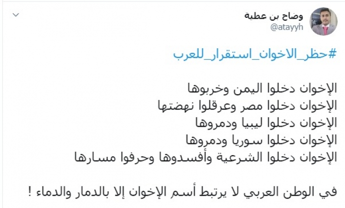 وكتب عبر تغريدة له على "تويتر" رصدها "المشهد العربي": "الإخوان دخلوا اليمن وخربوها، دخلوا مصر وعرقلوا نهضتها، دخلوا ليبيا ودمروها، دخلوا سوريا ودمروها، دخلوا الشرعية وأفسدوها وحرفوا مسارها".