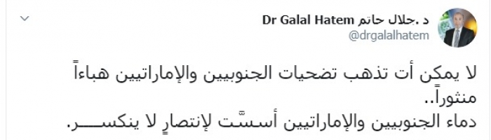 حاتم: دماء الجنوبيين والإماراتيين أسست لانتصار لا ينكسـر