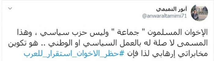 وكتب عبر تغريدة له على "تويتر" رصدها "المشهد العربي": "الإخوان المسلمون" جماعة وليس حزبا سياسيا، وهذا المسمى لا صلة له بالعمل السياسي أو الوطني، هو تكوين مخابراتي إرهابي لذا فإن حظر الإخوان استقرار للعرب".