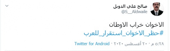 وكتب "الدويل" عبر تغريدة بتويتر، رصدها "المشهد العربي": "الإخوان خراب الأوطان".