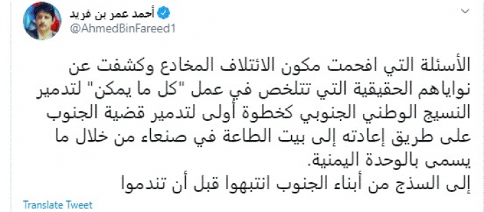 واختتم تغريدته قائلًا: "إلى السذج من أبناء الجنوب انتبهوا قبل أن تندموا".