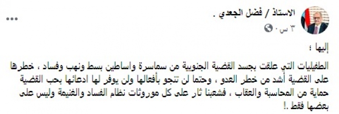 وكتب عبر تغريدة له على "تويتر" رصدها "المشهد العربي": "الطفيليات التي علقت بجسد القضية الجنوبية من سماسرة وأساطين بسط ونهب وفساد، خطرها على القضية أشد من خطر العدو، وحتما لن تنجو بأفعالها ولن يوفر لها ادعاؤها بحب القضية حماية من المحاسبة والعقاب، فشعبنا ثار على كل موروثات نظام الفساد والغنيمة وليس على بعضها فقط".