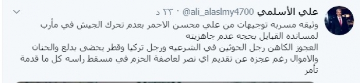 وكتب عبر تغريدة له على "تويتر" رصدها "المشهد العربي": "وثيقة مسربة توجيهات من علي محسن الأحمر بعدم تحرك الجيش في مأرب لمساندة القبائل بحجة عدم جاهزيته".