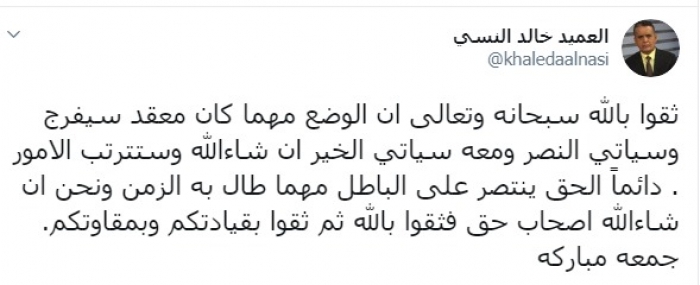 وكتب عبر تغريدة له على "تويتر" رصدها "المشهد العربي": "ثقوا بالله سبحانه وتعالى، إن الوضع مهما كان معقدا سيفرج وسيأتي النصر ومعه سيأتي الخير إن شاء الله وستترتب الأمور، دائما الحق ينتصر على الباطل مهما طال به الزمن ونحن إن شاء الله أصحاب حق، فثقوا بالله ثم ثقوا بقيادتكم وبمقاومتكم".