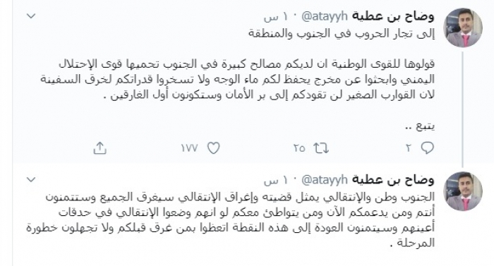 وكتب عبر تغريدة له على "تويتر" رصدها "المشهد العربي": "إلى تجار الحروب في الجنوب والمنطقة، قولوها للقوى الوطنية إن لديكم مصالح كبيرة في الجنوب تحميها قوى الاحتلال اليمني، وابحثوا عن مخرج يحفظ لكم ماء الوجه ولا تسخروا قدراتكم لخرق السفينة لأن القوارب الصغيرة لن تقودكم إلى بر الأمان وستكونون أول الغارقين" .