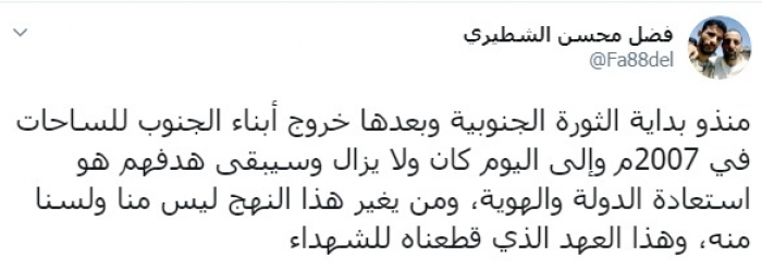 وكتب عبر تغريدة له على "تويتر" رصدها "المشهد العربي": "منذ بداية الثورة الجنوبية وبعدها خرج أبناء الجنوب للساحات في 2007م وإلى اليوم كان ولا يزال وسيبقى هدفهم هو استعادة الدولة والهوية، ومن يغير هذا النهج ليس منا ولسنا منه، وهذا العهد الذي قطعناه للشهداء".