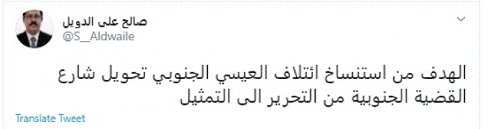 وكتب في تغريدة عبر "تويتر" رصدها "المشهد العربي": "الهدف من استنساخ ائتلاف العيسي الجنوبي تحويل شارع القضية الجنوبية من التحرير إلى التمثيل".