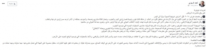 وكتب "الربيزي" في تغريدة عبر تويتر، رصدها "المشهد العربي": "في منتصف فبراير ٢٠١٨ عُيّن "مارتين غريفيث" مبعوثا دوليا إلى اليمن، ومنذ قدومه لاحظ الرجل ذو الخبرة الكبيرة في حل الأزمات في مناطق كثيرة من العالم، أن هناك ثلاث قوى رئيسية تتصارع في اليمن والجنوب، وتحمل ثلاثة مشاريع واضحة، واستوعب بحنكته أن الأمر لم يعد صراعا بين شرعية وانقلاب".