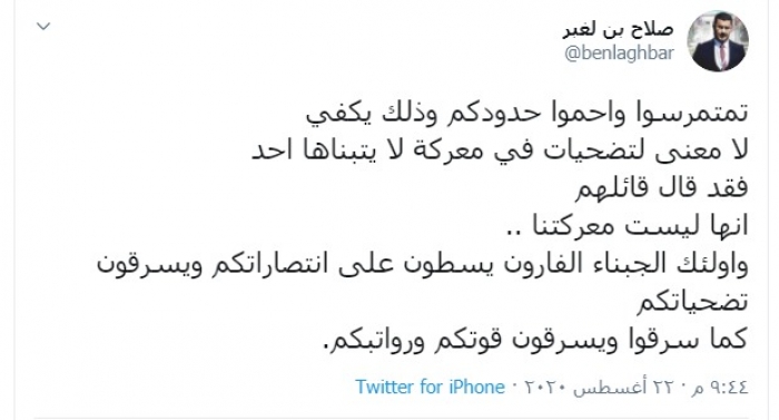وكتب "بن لغبر" تغريدة عبر تويتر، رصدها "المشهد العربي": "تمرسوا واحموا حدودكم وذلك يكفي، لا معنى لتضحيات في معركة لا يتبناها أحد".