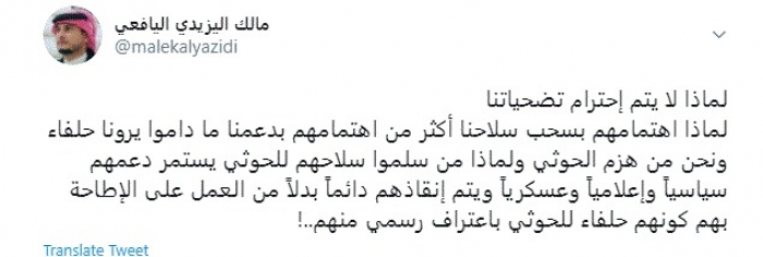 وقال في تغريدة عبر "تويتر" رصدها "المشهد العربي": "لماذا لا يتم احترام تضحياتنا. لماذا اهتمامهم بسحب سلاحنا أكثر من اهتمامهم بدعمنا ما داموا يرونا حلفاء ونحن من هزم الحوثي".