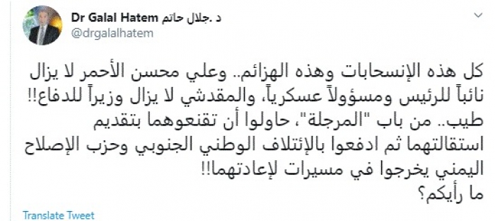 وقال في تغريدة عبر "تويتر" رصدها "المشهد العربي": "كل هذه الإنسحابات وهذه الهزائم.. وعلي محسن الأحمر لا يزال نائبًا للرئيس ومسؤولًا عسكريًا، والمقدشي لا يزال وزيرًا للدفاع".