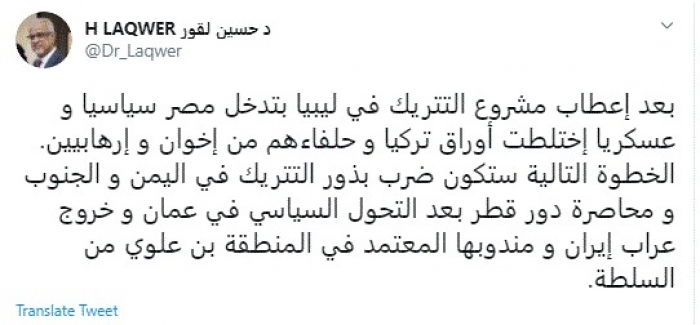 أكد المحلل السياسي الدكتور حسين لقور، اليوم، أن الخطوة التالية بعد إعطاب المشروع التركي في ليبيا تتمثل ضرب بذور التتريك في اليمن والجنوب.