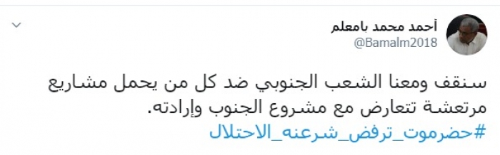 وكتب عبر تغريدة له على "تويتر" رصدها "المشهد العربي": "سنقف ومعنا الشعب الجنوبي ضد كل من يحمل مشاريع مرتعشة تتعارض مع مشروع الجنوب وإرادته".