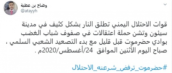 وكتب في تغريدة عبر "تويتر" رصدها "المشهد العربي": "قوات الاحتلال اليمني تطلق النار بشكل كثيف في مدينة سيئون وتشن حملة اعتقالات في صفوف شباب الغضب بوادي حضرموت قبل قليل مع بدء التصعيد الشعبي السلمي، صباح اليوم الاثنين الموافق 24/أغسطس/2020م".