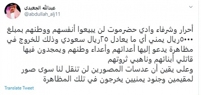 وكتب في تغريدة عبر "تويتر" رصدها "المشهد العربي": "أحرار وشرفاء وادي حضرموت لن يبيعوا أنفسهم ووطنهم بمبلغ ٥٠٠٠ريال يمني أي ما يعادل ٢٥ريال سعودي وذلك للخروج في مظاهرة يدعو إليها أعدائهم وأعداء وطنهم ويمجدون فيها قاتلي أبنائهم وناهبي ثروتهم".