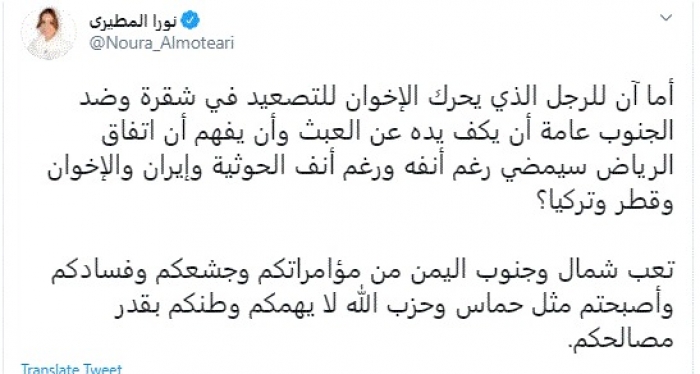 وأضافت: "أن يكف يده عن العبث وأن يفهم أن اتفاق الرياض سيمضي رغم أنفه ورغم أنف الحوثية وإيران والإخوان وقطر وتركيا".
