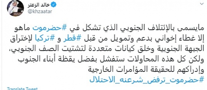 وكتب في تغريدة عبر "تويتر" رصدها "المشهد العربي": "ما يسمى بالائتلاف الجنوبي الذي تشكل في حضرموت ماهو إلا غطاء إخواني بدعم وتمويل من قبل قطر وتركيا لاختراق الجبهة الجنوبية وخلق كيانات متعددة لتشتيت الصف الجنوبي".