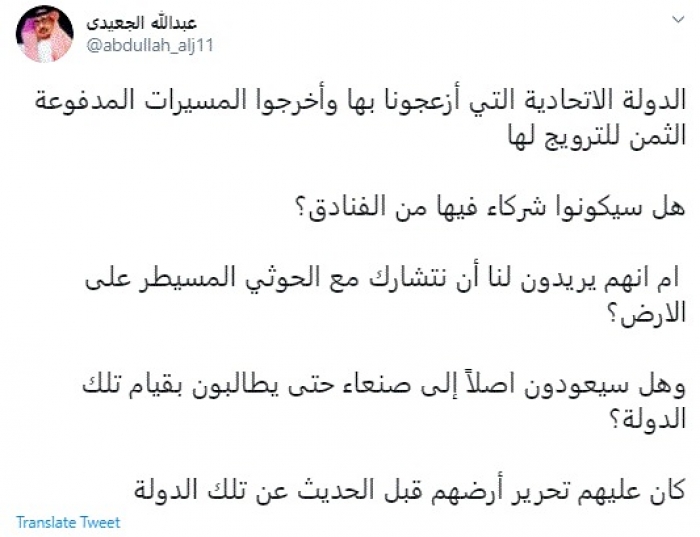 وأوضح: "وهل سيعودون أصلًا إلى صنعاء حتى يطالبون بقيام تلك الدولة؟ كان عليهم تحرير أرضهم قبل الحديث عن تلك الدولة".