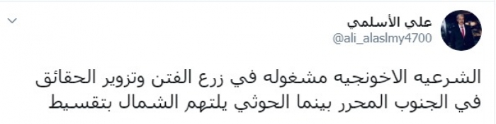 هاجم الناشط السياسي علي الأسلمي، اليوم الإثنين، شرعية الإخوان، مؤكدا أنها مشغولة بزرع الفتن وتزوير الحقائق في الجنوب بينما الحوثي يلتهم الشمال.