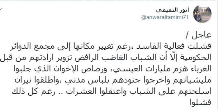 وكتب عبر تغريدة له على "تويتر" رصدها "المشهد العربي": "فشلت فعالية الفاسد، رغم تغيير مكانها إلى مجمع الدوائر الحكومية إلّا أن الشباب الغاضب الرافض تزوير إرادتهم من قبل الغرباء هزم مليارات العيسي، ورصاص الإخوان الذي جلبوا مليشياتهم وأخرجوا جنودهم بلباس مدني، وأطلقوا نيران أسلحتهم على الشباب واعتقلوا العشرات، رغم كل ذلك فشلوا".
