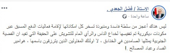 وكتب عبر تغريدة له على "تويتر" رصدها "المشهد العربي": "ليس هناك أعجز من سلطة فاسدة ومنبوذة تسخر كل إمكاناتها لإقامة فعاليات الدفع المسبق عبر مكونات ديكورية تم تفقيسها لخداع الناس والرأي العام للتشويش على الحقيقة التي تفيد أن القضية الجنوبية يمثلها الصامدون في الخنادق، لا أولئك المقاولون الذين يترزقون باسمها، هوامير الفساد وعباد المصالح".