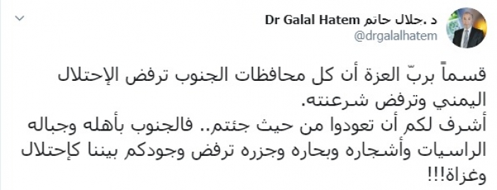 وكتب عبر تغريدة له على "تويتر" رصدها "المشهد العربي": "قسما بربّ العزة أن كل محافظات الجنوب ترفض الاحتلال اليمني وترفض شرعنته، أشرف لكم أن تعودوا من حيث جئتم، فالجنوب بأهله وجباله الراسيات وأشجاره وبحاره وجزره ترفض وجودكم بيننا كاحتلال وغزاة".