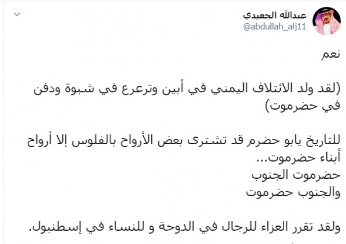 وكتب عبر تغريدة له على "تويتر" رصدها "المشهد العربي": "نعم لقد ولد الائتلاف اليمني في أبين وترعرع في شبوة ودفن في حضرموت، للتاريخ يا أبو حضرم، قد تشترى بعض الأرواح بالفلوس إلا أرواح أبناء حضرموت، حضرموت الجنوب ،والجنوب حضرموت، ولقد تقرر العزاء للرجال في الدوحة و للنساء في إسطنبول".