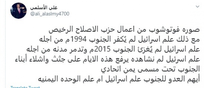 وقال في تغريدة عبر "تويتر" رصدها "المشهد العربي": "صورة فوتوشوب من أعمال حزب الإصلاح الرخيص مع ذلك علم اسرائيل لم يُكفر الجنوب 1994م من أجله".