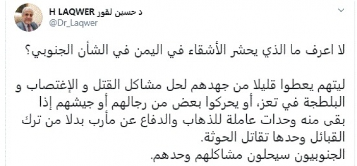 واختتم تغريدته قائلًا: "الجنوبيون سيحلون مشاكلهم وحدهم".