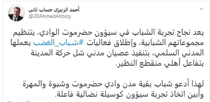 وقال في تغريدة عبر "تويتر" رصدها "المشهد العربي": "بعد نجاح تجربة الشباب في سيئون حضرموت الوادي، بتنظيم مجموعاتهم الشبابية، وإطلاق فعاليات شباب الغضب بعملها المدني السلمي، بتنفيذ عصيان مدني شل حركة المدينة بتفاعل أهلي منقطع النظير".