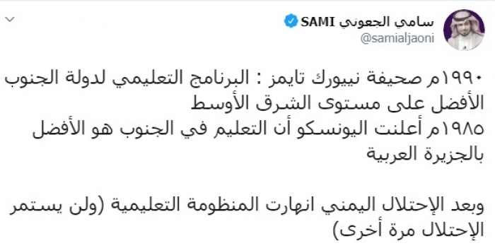 وكتب عبر تغريدة له على "تويتر" رصدها "المشهد العربي": "١٩٩٠م صحيفة نيويورك تايمز، البرنامج التعليمي لدولة الجنوب الأفضل على مستوى الشرق الأوسط، ١٩٨٥م أعلنت اليونسكو أن التعليم في الجنوب هو الأفضل بالجزيرة العربية، وبعد الاحتلال اليمني انهارت المنظومة التعليمية (ولن يستمر الاحتلال مرة أخرى)".