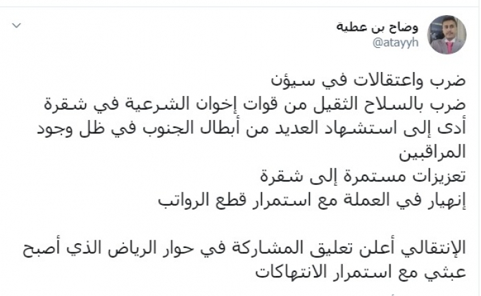 وكتب عبر تغريدة له على "تويتر" رصدها "المشهد العربي": "ضرب واعتقالات في سيئون، ضرب بالسلاح الثقيل من قوات إخوان الشرعية في شقرة أدى إلى استشهاد العديد من أبطال الجنوب في ظل وجود المراقبين، تعزيزات مستمرة إلى شقرة، انهيار في العملة مع استمرار قطع الرواتب، الانتقالي أعلن تعليق المشاركة في حوار الرياض الذي أصبح عبثيا مع استمرار الانتهاكات".