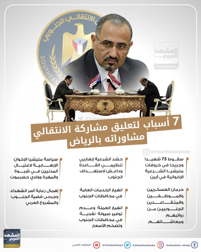 7 أسباب لتعليق الانتقالي مشاوراته بالرياض (إنفوجراف)