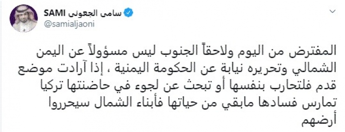 وكتب في تغريدة عبر "تويتر" رصدها "المشهد العربي": "المفترض من اليوم ولاحقًأ الجنوب ليس مسؤولًا عن اليمن الشمالي وتحريره نيابة عن الحكومة اليمنية".