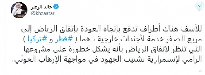 الزعتر: قطر وتركيا يدفعان بإعادة اتفاق الرياض لمربع الصفر